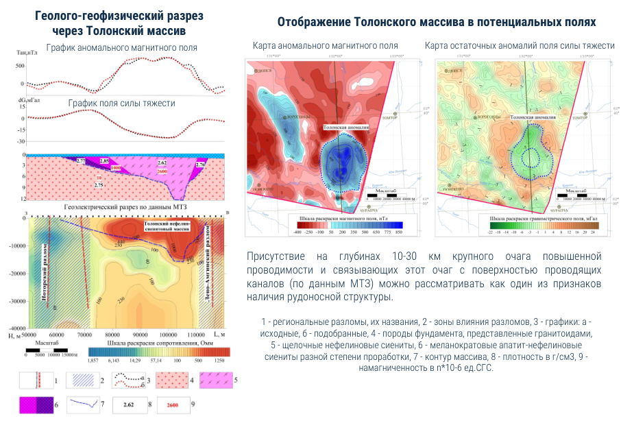 Толонский массив представляет интерес на обнаружение редкоземельных элементов, поскольку вмещающий их интрузивный массив расположен вблизи населенных пунктов, вблизи федеральной трассы и характеризуется значительными размерами, что позволяет прогнозировать масштабность оруденения.