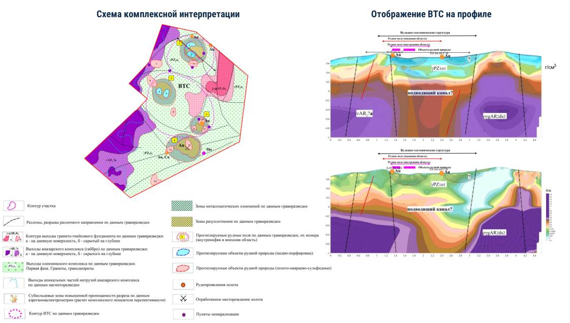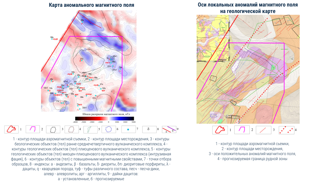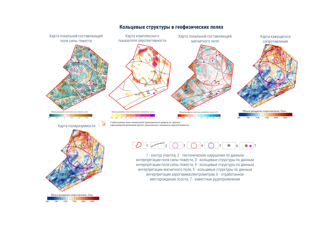 - Оконтурены перспективные участки (рудные поля), в пределах которых прогнозируются аномалии рудной природы. Они располагаются в пределах ВТС.