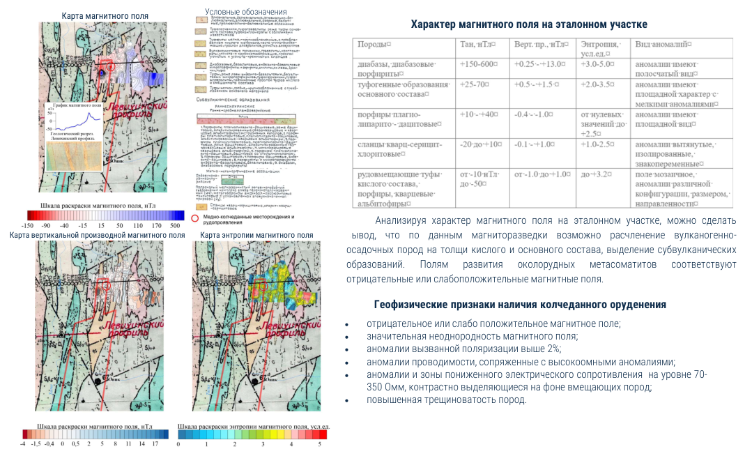 - Интерпретация полученных данных на опытном участке-эталоне (известном месторождении). Определены геофизические признаки наличия колчеданного оруденения.