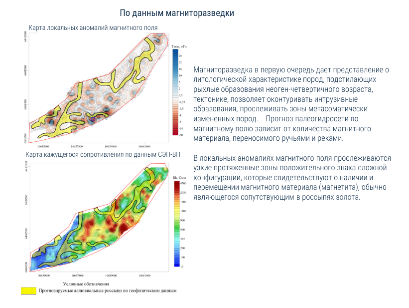 - Оконтурены аномальные зоны, которые связываются с увеличением мощности рыхлых отложений и потенциально перспективные на обнаружение россыпей. В их пределах локализовано два участка, которые рекомендуются к заверке бурением.