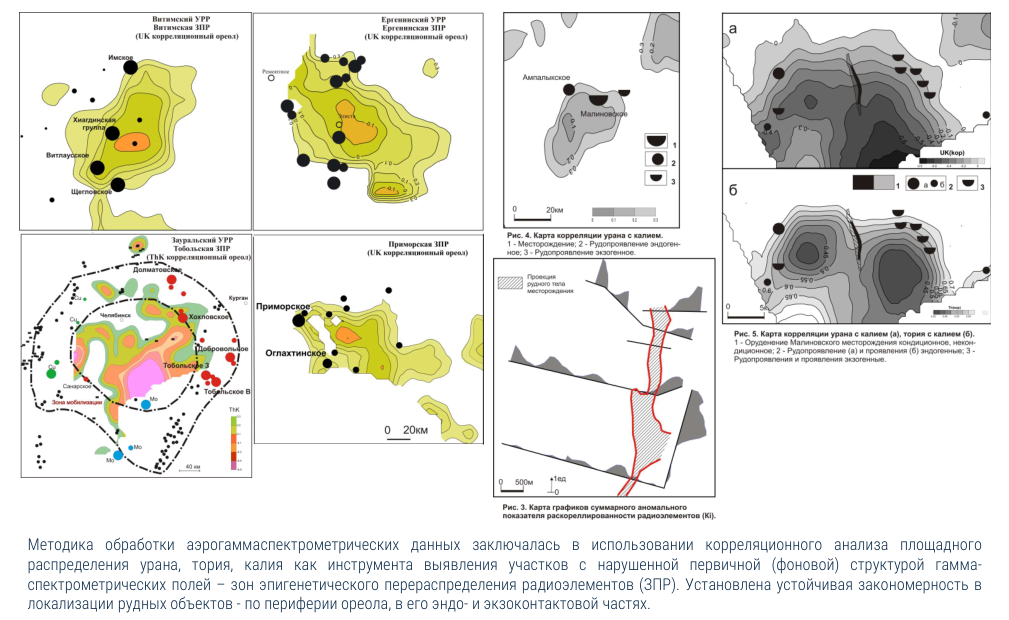 - Проведение корреляционного анализа материалов гамма-спектрометрии с выделением аномальных корреляционных ореолов как поискового критерия на крупномасштабное урановое оруденение возможно на всех этапах ГГР.